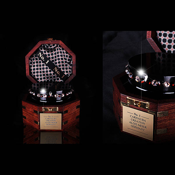 De presentatie is van koninklijke klasse: “No.1” CARNAUBA wordt geleverd in een Oak Treasure Case met vergulde metalen scharnieren en afwerkingen. De pure zwarte glazen pot, voorzien van een Swarovski-kristallen handgreep, rust op een satijnen inlay met gegraveerde goudplaat en vilten basis. Iedere toepassing voelt aan als een exclusieve ceremonie binnen high-end detailing.